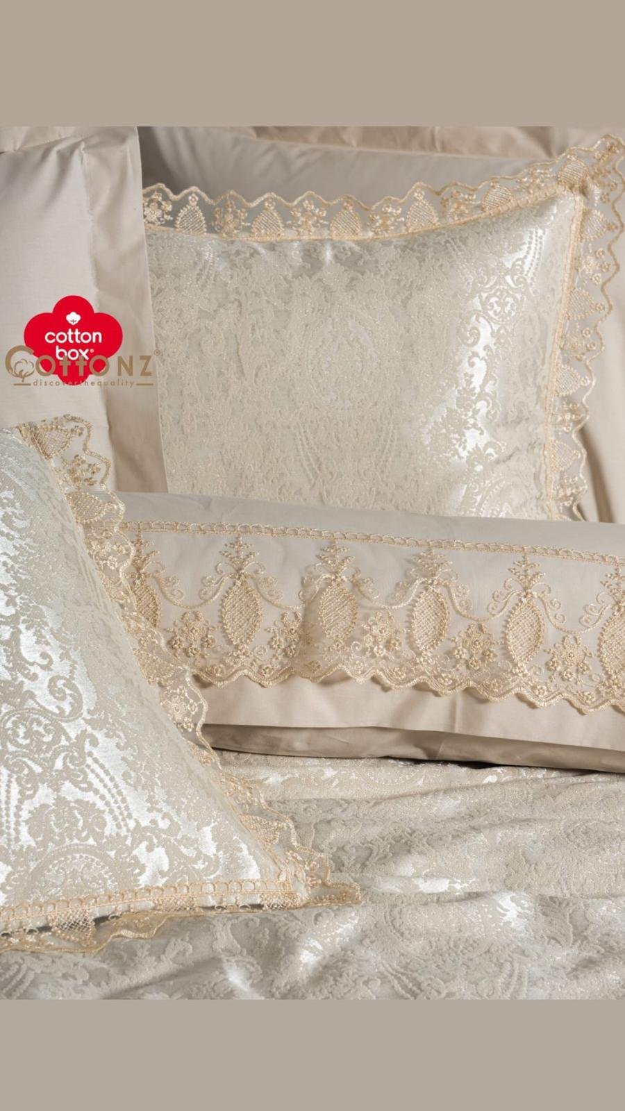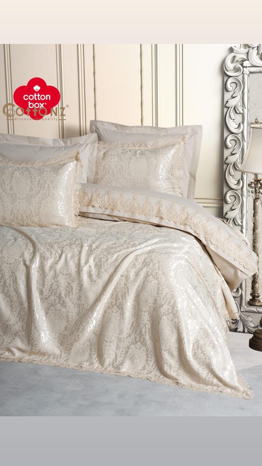 كل القطع قطن 100% مع تصميم دانتيل كما واضح بالصوره والشرشف قماش جاكارد فاخر